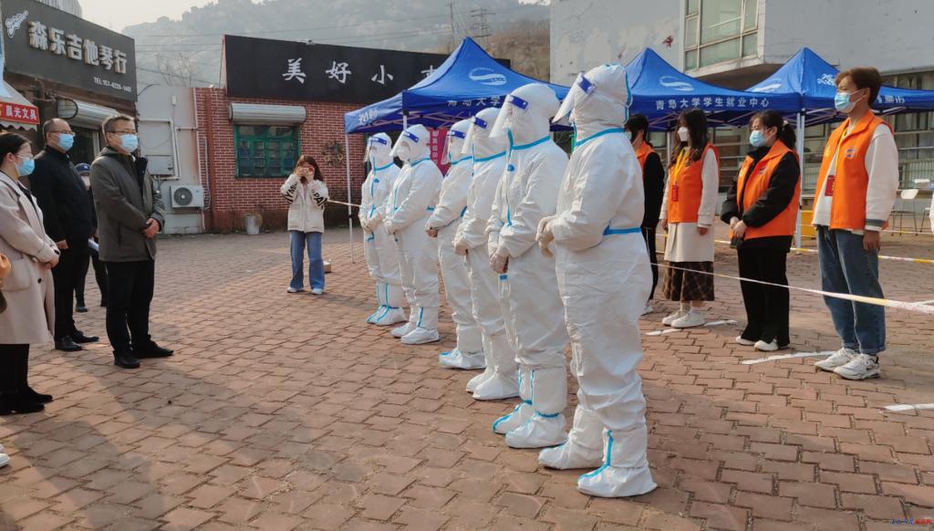 在新設立的浩園核酸檢測點,校黨委常委、紀委書記、省監委駐青島大學監察專員范玉斌詳細了解了公共衛生學院師生在醫學部、后勤管理處、安全保衛處、網絡中心、校醫院等單位的大力支持下,24小時內建成新點并正常運行的情況。他鼓勵師生們再接再厲、昂揚進取,在今后的學習、工作中收獲更多的成果。
