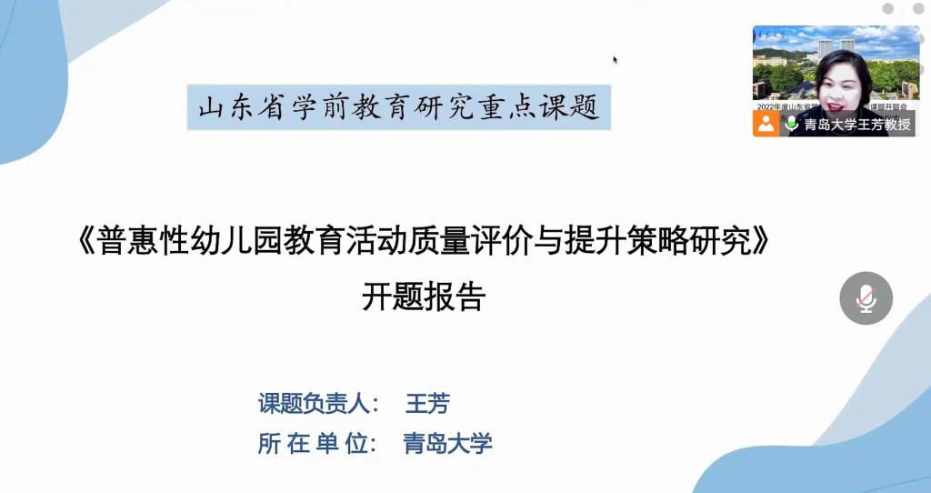 課題負責人王芳代表課題組做《普惠性幼兒園教育活動質(zhì)量評價與提升策略研究》和學前教育基地建設項目《幼兒園游戲案例“做-研-寫-用”四位一體研修模式的構建與應用》的報告。