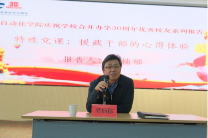 新聞網(wǎng)訊 3月25日下午,自動化學(xué)院慶祝學(xué)校合并辦學(xué)30周年優(yōu)秀校友報告會在會議中404室舉行。報告會邀請到學(xué)院杰出校友梁楠郁為學(xué)院師生講授特殊黨課——援藏干部的心得體驗。自動化學(xué)院黨委書記張新柏、黨委副書記于宏、全體輔導(dǎo)員和學(xué)生黨員參加報告會。報告會由于宏主持。