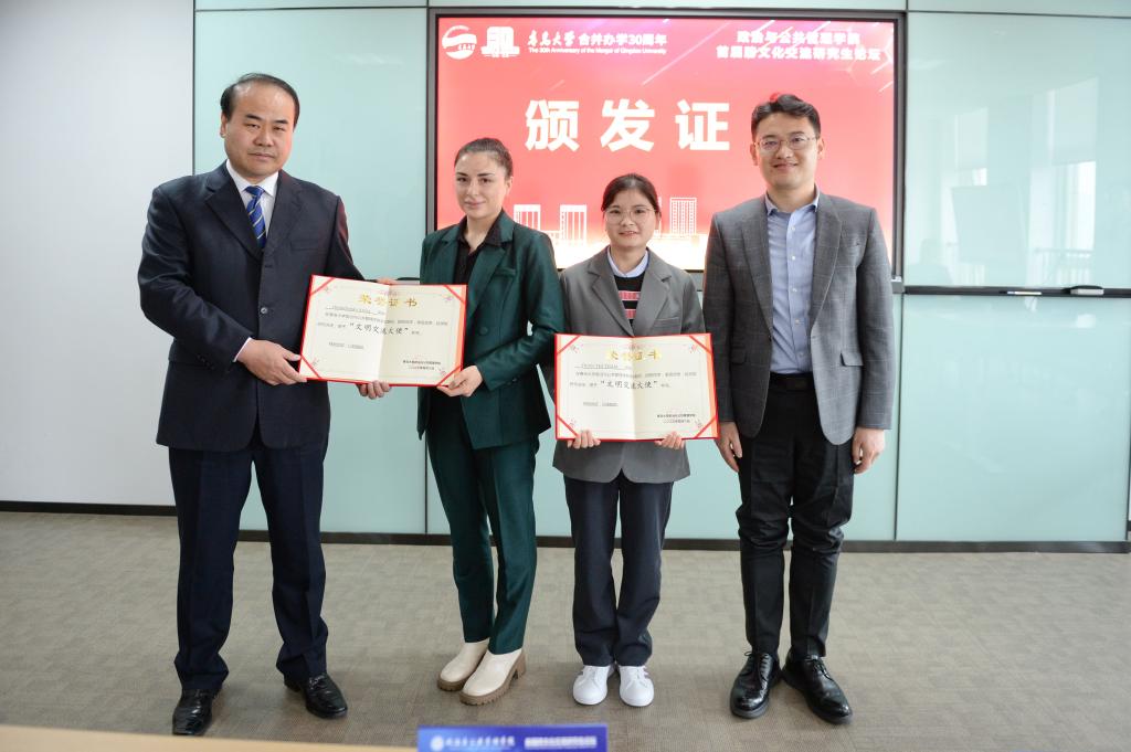 開幕式上,汪運波為首屆跨文化交流研究生論壇發表致辭,陳洪連介紹政治與公共管理學院國際化辦學成效,汪運波與周允旭為政治與公共管理學院2020級國際關系專業越南留學生陳氏深(TRAN THI THAM)和烏克蘭留學生阿麗娜(Onishchenko Aryna)頒發政治與公共管理學院“文明交流大使”證書。