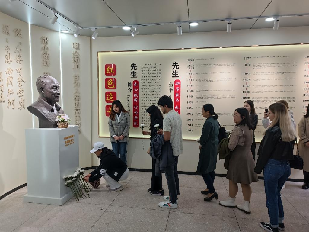 校史館參觀結束后,為學習張嗣瀛院士在愛國、治學、為師、為人方面的家國情懷和科學精神、卓越貢獻與高尚情操,表達對張院士的深切懷念之情,國際教育學院師生及我校留學生代表來到自動化學院,開展了張嗣瀛院士精神學習交流活動,在嗣瀛星火宣講團同學的帶領下進行了張嗣瀛院士精神學習和座談交流,繼續傳承他精誠報國、以身許國的家國情懷和專心、專業、專注的科學精神。學習座談會結束后,全體參會人員和留學生代表向院士雕像敬獻鮮花,集體誦讀致敬張嗣瀛院士的詩歌。