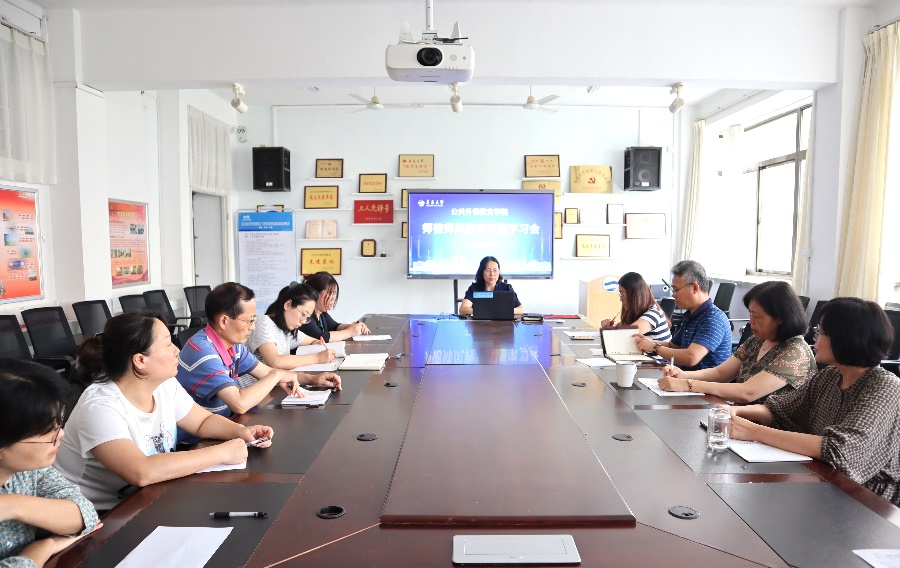 新聞網(wǎng)訊 7月7日下午,公共外語(yǔ)教育學(xué)院召開師德師風(fēng)教育專題學(xué)習(xí)會(huì),全體教職工參加學(xué)習(xí)。院黨委書記劉海榮主持會(huì)議。