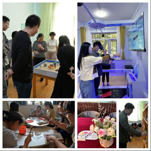 心理健康教育與研究中心主任米振宏介紹了中心秉承的工作理念“用專業溫暖每一個心靈,讓生命在此綻放”,她帶領老師們參觀了預約接待室、藝術治療室、團體活動室、VR訓練室、沙盤游戲室、心理測評室、宣泄室等功能室。米振宏結合自身工作經驗從心理學入手,列舉典型案例,深入淺出地講解了師生心理健康的重要性以及青少年常見心理問題及應對。講座結束后,老師們詳細觀摩并體驗了插花、繪畫、沙盤、互動游戲等相關功能室及活動。