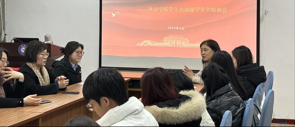 新聞網訊 3月4日,外語學院為40余名公派出國學生以及上合英俄創新班的同學舉辦了第二期出國留學安全培訓會。學院黨委副書記王海青、英語系副主任王薇、教師劉曉玲出席并發言,培訓會由院團委書記王揚主持。