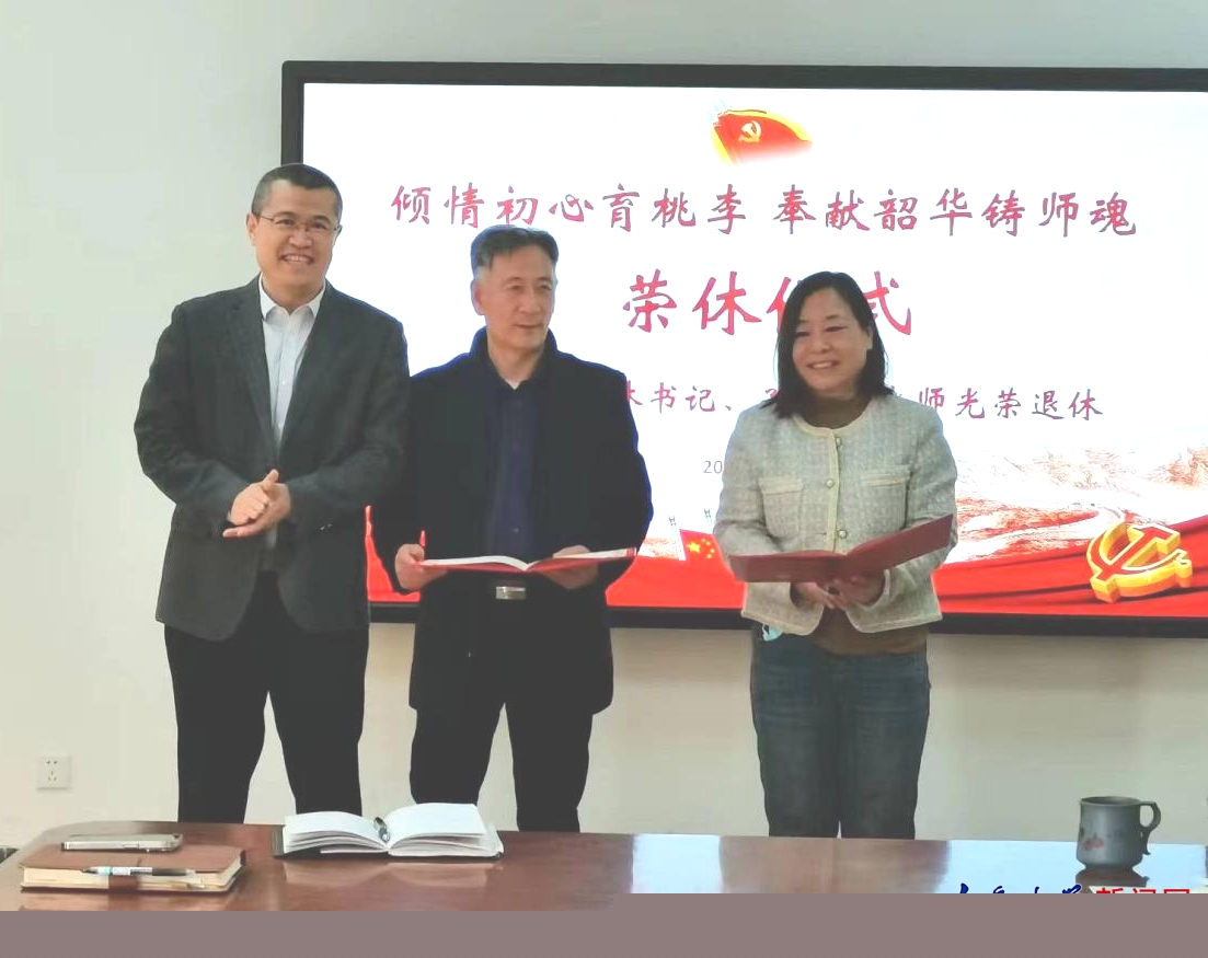 參加儀式的領導、老師,與兩位退休教師一起談過往、憶青春、講學習、講正氣,表示要以榮退休教師為榜樣,初心不改、甘于奉獻,并祝愿榮休教師們健康充實,退休生活幸福美滿。